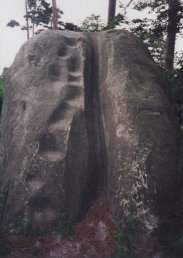 Geology Before this stone is described, it might be worth explaining the geology that caused it. The sandstone cliffs that form the greater part of the camp are not uniform. The upper part of the cliffs are of a hard sandstone that is suitable for use in building. The lower part is far softer and is very wet due to the level of the water table being higher than the base of the cliffs. The sandstone also has a tendancy to split vertically, causing caves and narrow paths between the rocks. There are two valleys either side still containing streams, one being used for a hammer pond, and springs lower down the hill. The combination of these factors has caused the above named stone to form. It is a large block of sandstone separate from the main cliffs, with the soft layer underneath worn away to a thin shaft. Imagine a stone from a road runner cartoon, though some early observers seemed to think the edifice was one separate stone balanced upon another and this is probably where the stone got it's name. Big-Upon-Little The stone was a great attraction for tourists at some point and there are initials carved wherever a hand could reach, dating anywhere from the 17th century, with initials being carved over others and the effects of the weather leaving the possibility of earlier dates, indeed Thomas Pownall in 1778 tell us that the stone "was covered with multitudes of names and initials of all dates". The top of the rock next to it is easily accessible allowing the brave to jump across to the top of Big-Upon-Little. The author of this page found copper coins left there like some sort of votive offering. Though Big-Upon-Little is the most famous in the camp, it is not the only marked stone. Another Carved Stone